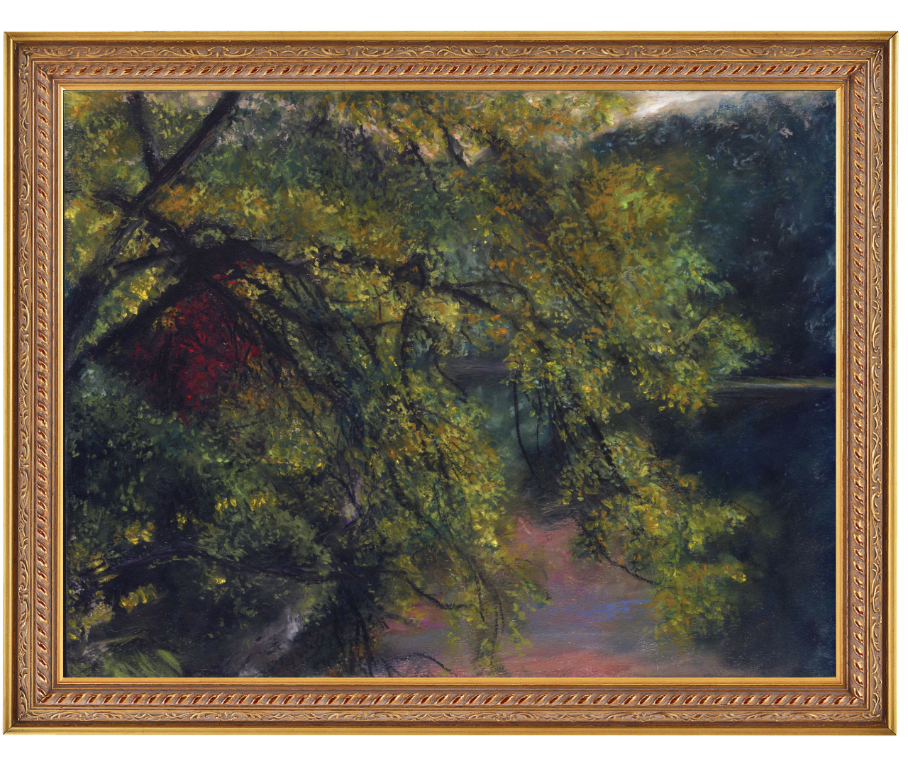 This view over the river was originally a photograph I took on a bridge while walking with my family. We were camping in the 𝘏𝘢𝘳𝘮𝘰𝘯𝘺, PA area during the peak of fall. Taking a stroll through nature with the sun slowly dipping down the hills is one of the best ways I can picture spending an evening. That trip, even being a short weekend, is still memorable for its small-town charm and beautiful Appalachian views.