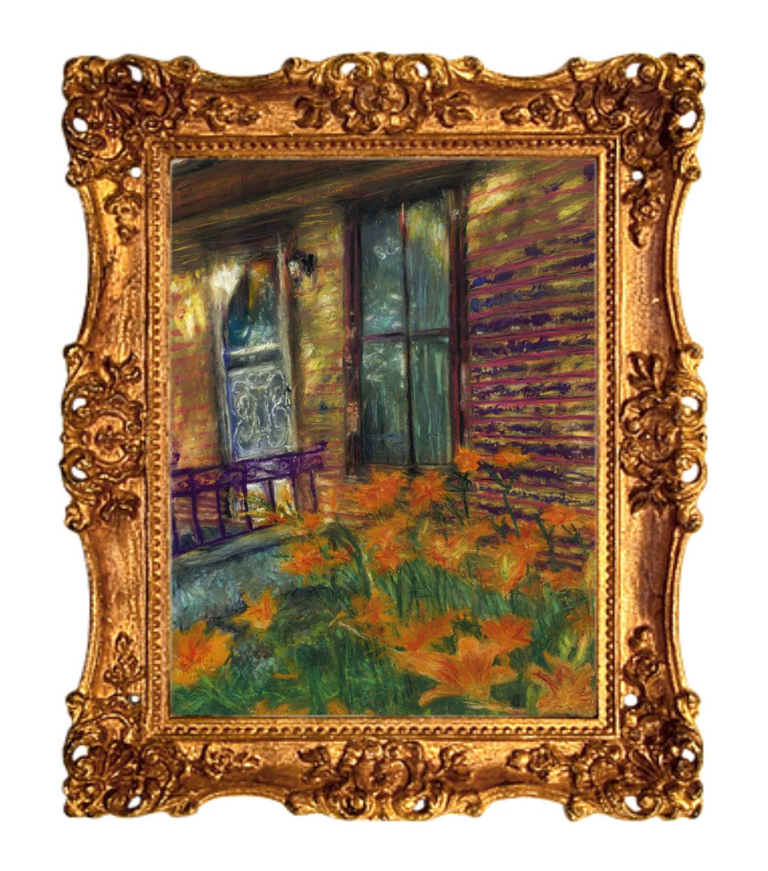 A time capsule depicting the house on the opposite corner from my childhood home. For the longest time, it decayed while I crunched the seed pods from the honeysuckle tree beside it every fall. This home did end up getting some love in recent years, but I fondly remember the way it was when I was a kid—falling apart. I liked to imagine the history it had and how it looked inside. So with this piece, I tapped into a colorful palette. Bold and exaggerated, like looking through a child's eyes: specifically, my own. 𝘈𝘤𝘳𝘰𝘴𝘴 𝘵𝘩𝘦 𝘚𝘵𝘳𝘦𝘦𝘵 is extra special to me as the reference is one of my earliest pictures from the start of my photography journey at 14.
